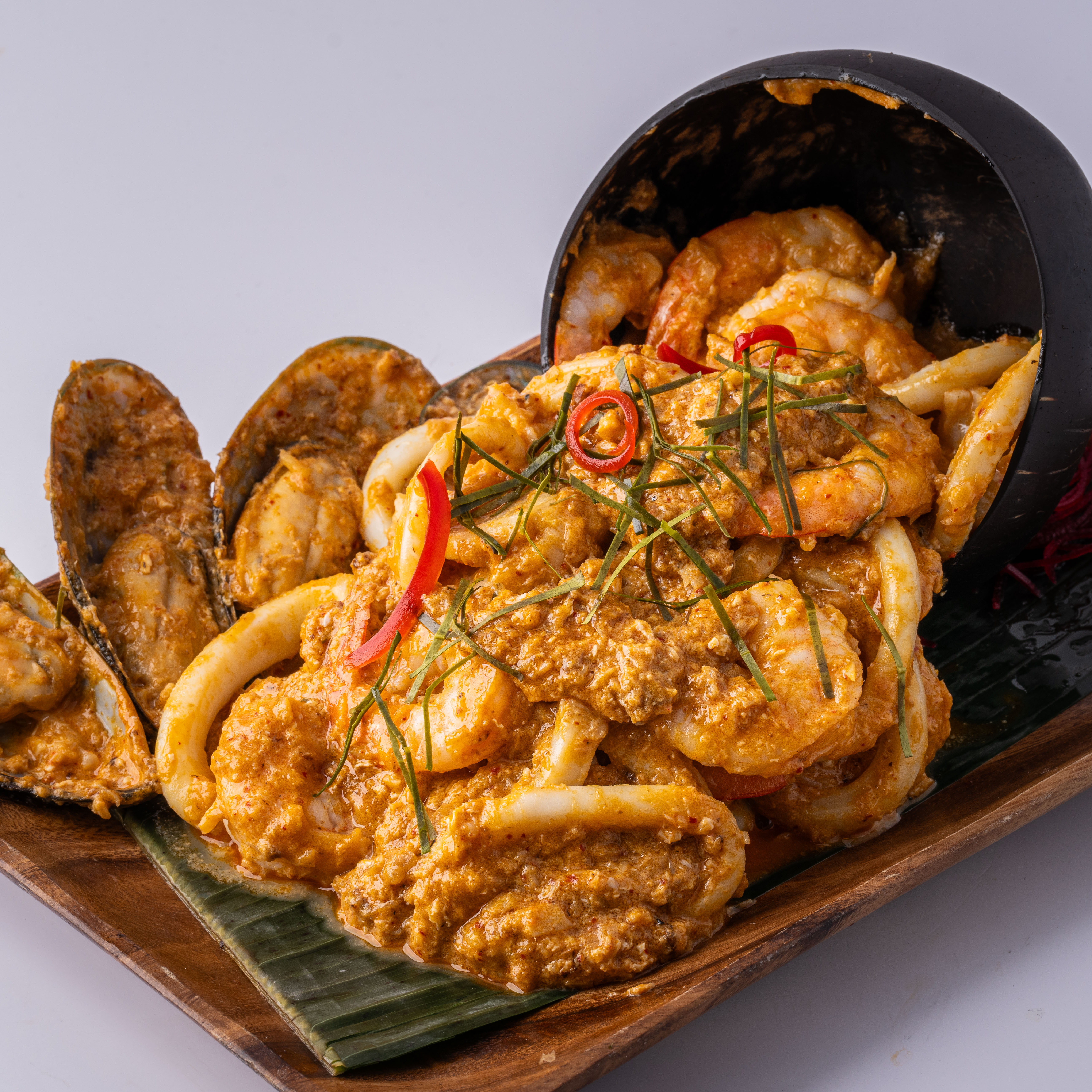 Steamed seafood (Shrimp, Squid, Scallop, Mussel) in red curry sauce and coconut milk with\npepper and kaffir lime leaves.