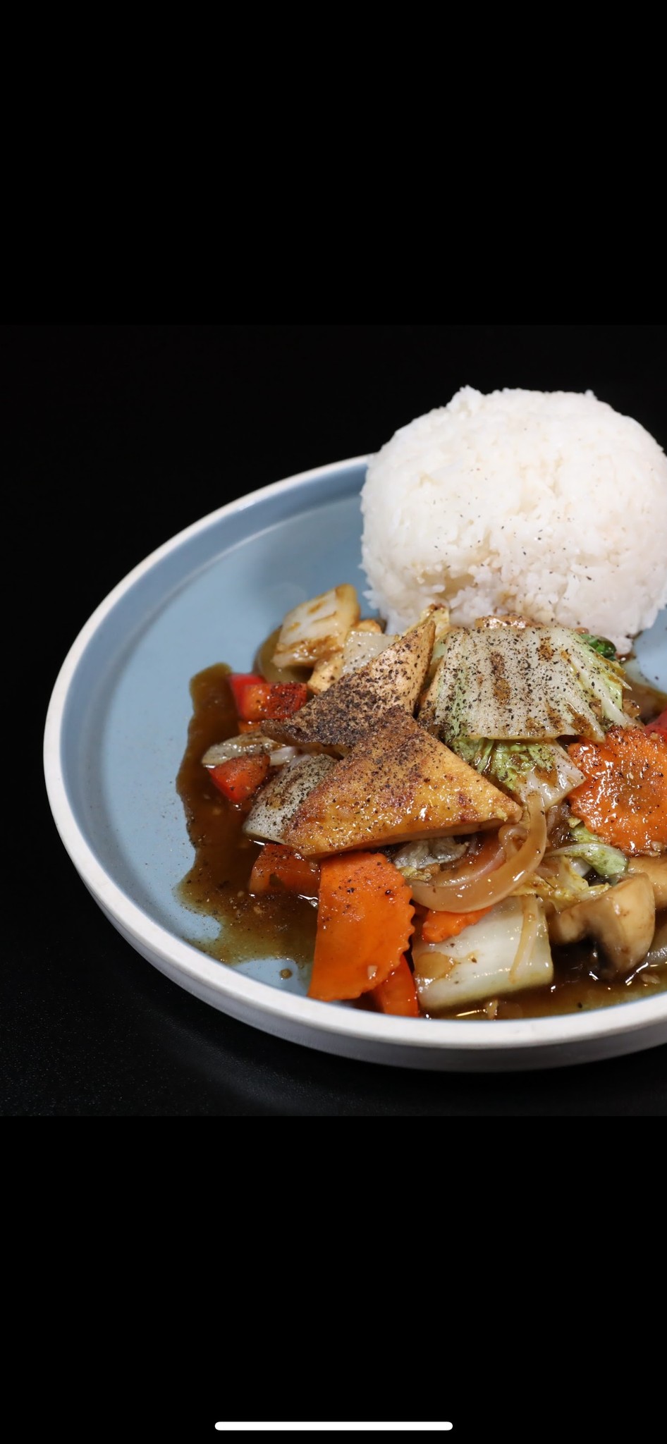 Coconut curry with tofu, bell peppers, green peppers, basil, and bamboo shoots.